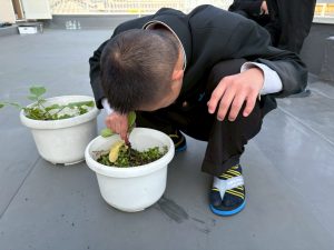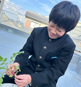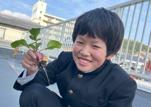 ブルーム菜園 2025/12/19 この記事を書いている人 - WRITER - futaba 9月下旬に種をまき、水やりをしたり、雑草を抜いたりしてコツコツ世話をした、ラディッシを収穫しました。 どれにしようか葉っぱの大きさを見ながら、大きなものを選んで収穫してみると… 「採れた。いぇーい!」 「あれ?葉っぱは大きいけど、ラディッシ小さい!」 「小さくて、かわいいな」 葉っぱの大きさとラディッシの大きさは比例しないことを知りました。 収穫ができて、嬉しそうな笑顔♪素敵ですね。 同じ時期に種をまいた、ほうれん草も育ってきています。次の収穫が楽しみですね✨ この記事を書いている人 - WRITER - futaba 関連記事 - Related Posts - プラネタリウム作り 秋の散策 一緒に合格を勝ち取ろう🌸 泥だんご作りにチャレンジ✨ 最新記事 - New Posts - ブルーム菜園 秋の散策 ハロウィンウィーク 氷で涼を感じよう~氷釣り実験~