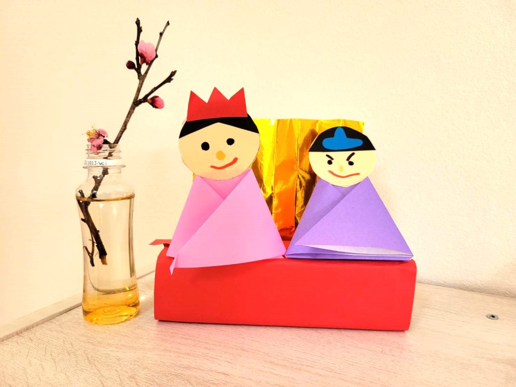 ニュース 2022/03/07 ひな祭り製作🎎 3月3日にひな祭りのお祝いをしました。 「桃の節句」とも呼ばれる女の子の健やかな成長を願う行事です。 お内裏様とお雛様の顔を描き、 鮮やかな模様の折り紙で着物を作りました。 かわいいお内裏様とお雛様の完成です! 部屋に飾ると華やかになりました。