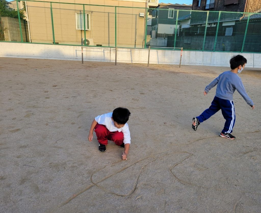 ニュース 2022/10/31 遊び名人発見! 天気も良く絶好の公園日和になった日の出来事です。 外に出て思いきり身体を動かして遊びました。 枝を見つけて地面に何やら線を引いています。 枝を見つけた友だちがその上を歩くと、 勢いよくグルグルの線やギザギザの線が…。 「僕も入れてよ!」「いいよ」 どんどん友だちが集まって電車ごっこが始まりました。 友だちの遊んでいることに興味を持ち、遊びを発展させて、みんなで楽しく遊べる”遊び名人”の発見でした!